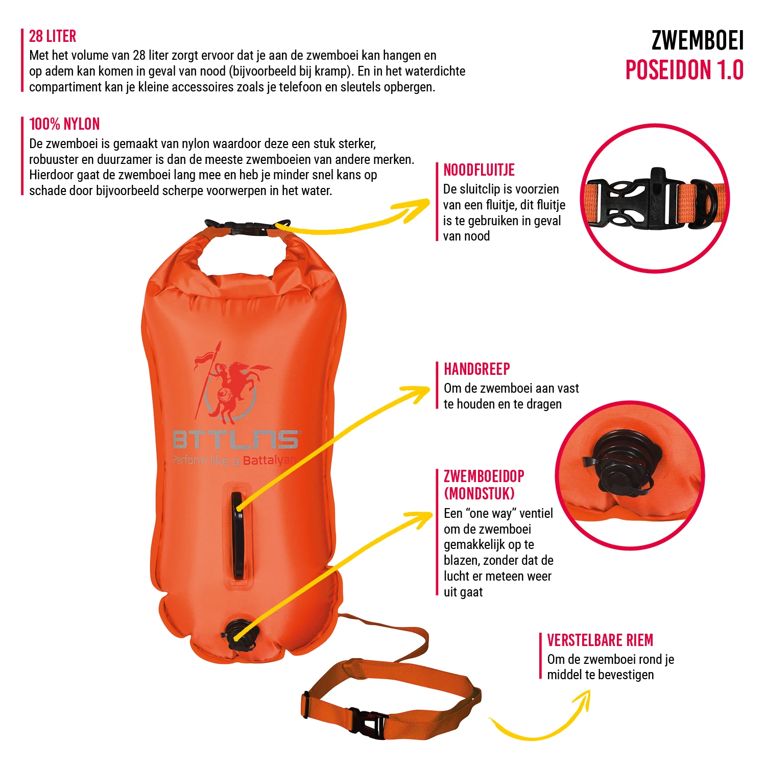 Waarschuwing: deze zwemboei is GEEN reddingsmiddel. Open water zwemmen is een gevaarlijke sport. Zwem nooit alleen, zwem altijd samen met een buddy of zwem met een groep.